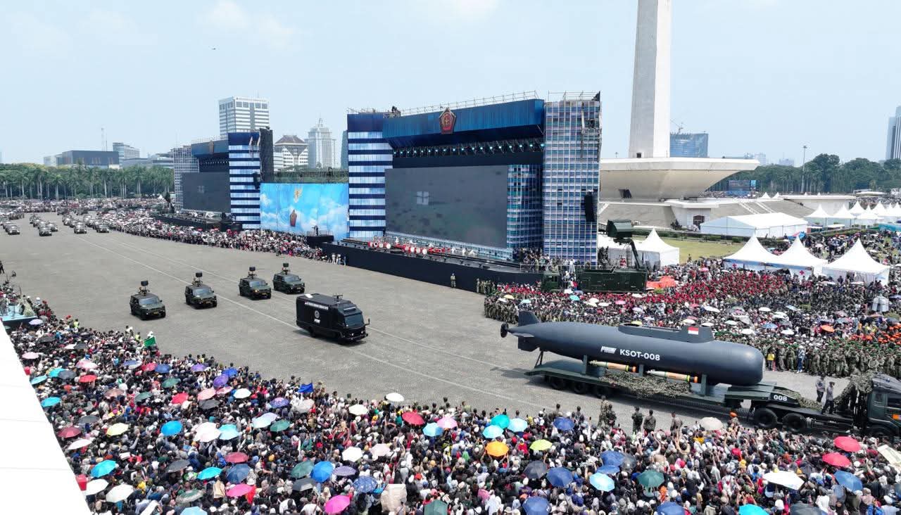 Defile kemudian dilanjutkan dengan pameran kekuatan alat utama sistem senjata (alutsista) yang menampilkan 1.047 peralatan pertahanan modern, antara lain kendaraan tempur, artileri medan, drone, kapal cepat, dan pesawat udara. Keikutsertaan alutsista buatan dalam negeri menjadi bukti kemandirian bangsa di bidang pertahanan sekaligus komitmen TNI mendukung kemajuan industri strategis nasional.