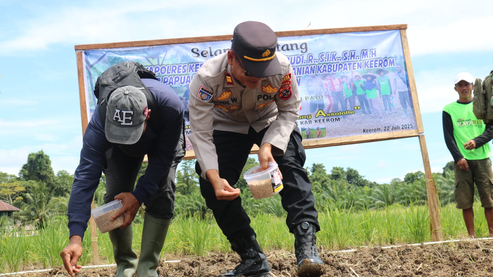 Papua – Demi mendukung program pemerintah dibidang ketahanan pangan Sat Binmas Polres Keerom bersama kelompok tani GANJA “Gabungan Anak Nanam Jagung Assolole” melakukan penanaman bibit padi dan jagung dikampung Yeeti, Distrik Arso Timur, Kabupaten Keerom, Rabu (23/07/2025).