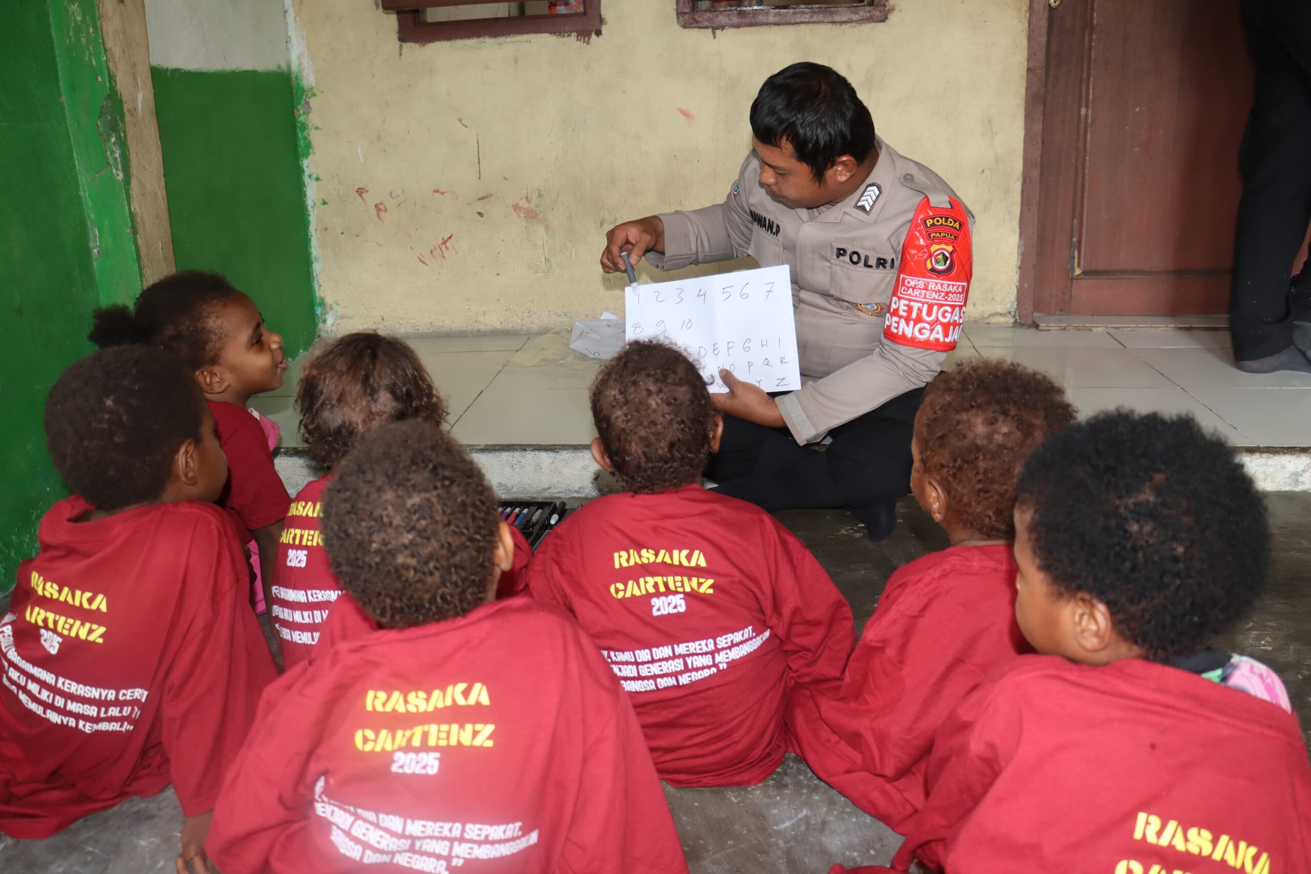 Papua – Polri terus berkomitmen meningkatkan kualitas pendidikan yang rutin dilaksanakan melalui Program Polisi Pi Ajar. Hal inilah yang dilakukan jajaran anggota Polisi di Kabupaten Yahukimo, Papua Pegunungan dengan mengajarkan anak-anak binaannya di jalan Sosial Distrik Dekai Kabupaten Yahukimo, Jumat (25/7/25).