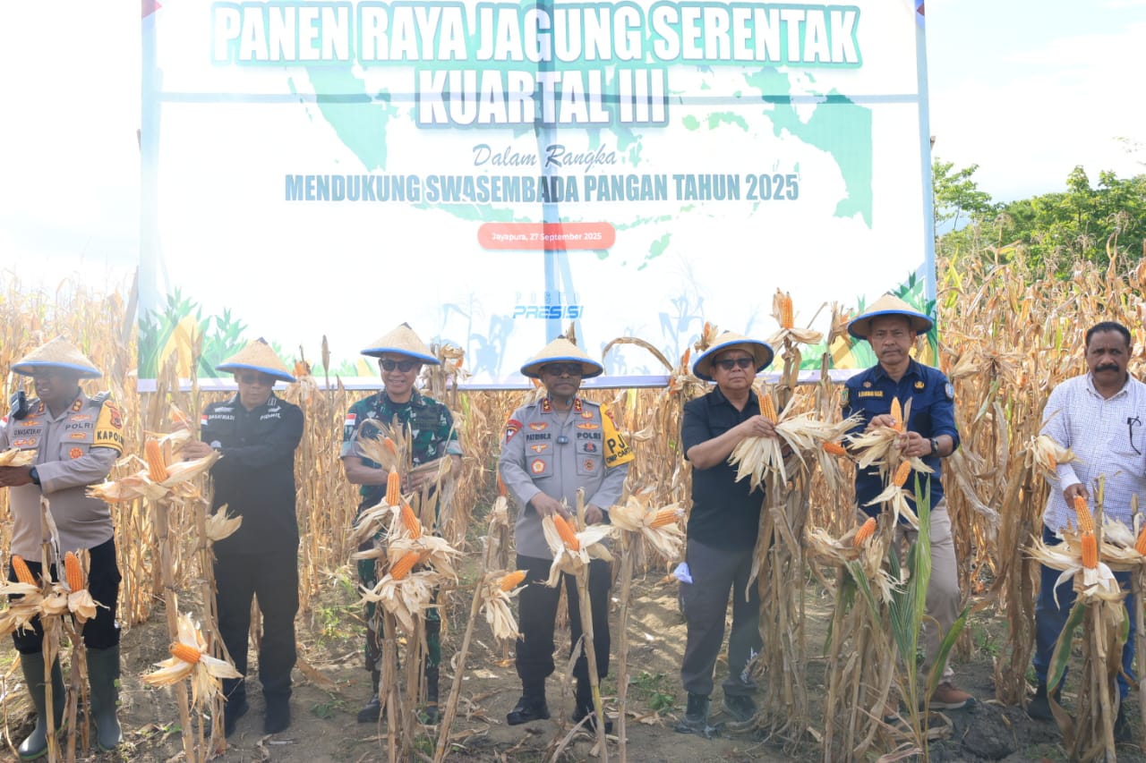Papua – Kepolisian Daerah Papua bersama TNI dan Pemerintah Daerah melaksanakan Panen Raya Jagung Kuartal III Tahun 2025 di Kampung Aib, Distrik Kemtuk, Kabupaten Jayapura. Kegiatan ini merupakan bagian dari program nasional dalam mendukung swasembada pangan serta mewujudkan ketahanan pangan berkelanjutan, Sabtu (27/9).