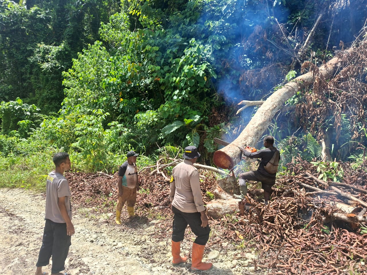 Pohon tumbang yang disebabkan oleh kondisi cuaca mengakibatkan terhambatnya arus lalu lintas serta aktivitas warga. Dengan menggunakan peralatan sederhana, personel kepolisian dan masyarakat bergotong royong membersihkan batang pohon, ranting, serta material lain yang menutupi badan jalan.