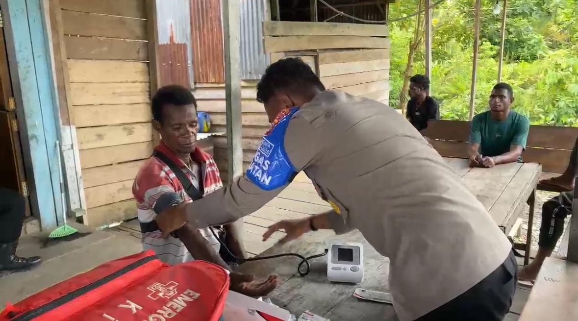 Papua – Subsatgas Keladisagu Polres Yahukimo melakukan pengecekan Kesehatan masyarakat yang bermukim di area sepeturan pelabuhan Sungai Lopon distrik Dekai Kabupaten Yahukimo,Rabu (9/7/25).