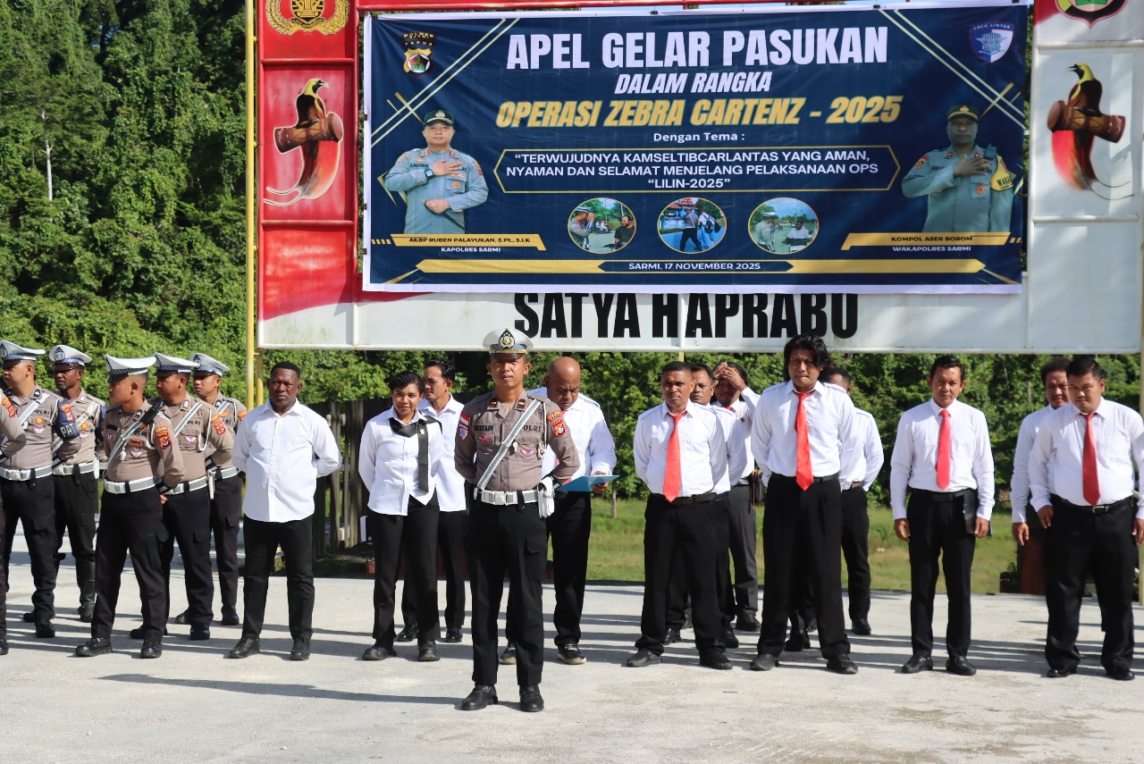 Sarmi – Kepolisian Resor Sarmi menggelar Apel Pasukan Operasi Zebra Cartenz 2025 dengan tema “Terwujudnya Kamseltibcar Lantas yang Aman, Nyaman dan Selamat Menjelang Pelaksanaan OPS Lilin 2025”. Kegiatan tersebut berlangsung di halaman Mapolres Sarmi, Senin pagi, dan dipimpin langsung oleh Kapolres Sarmi AKBP Ruben Palayukan, S.PT., S.I.K. Senin (17/11/2025)