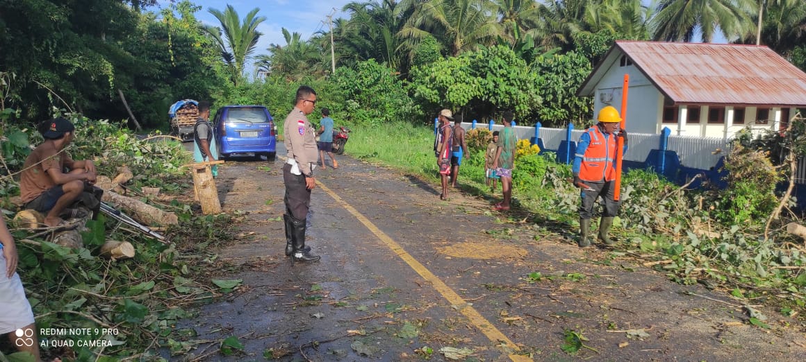 Sarmi – Personel Satuan Lalu Lintas (Sat Lantas) Polres Sarmi bersama warga masyarakat melakukan aksi cepat membantu membersihkan badan jalan yang tertutup pohon tumbang di Kampung Holmaven, Distrik Sarmi Timur, Kabupaten Sarmi, pada Minggu (10/11/2025).