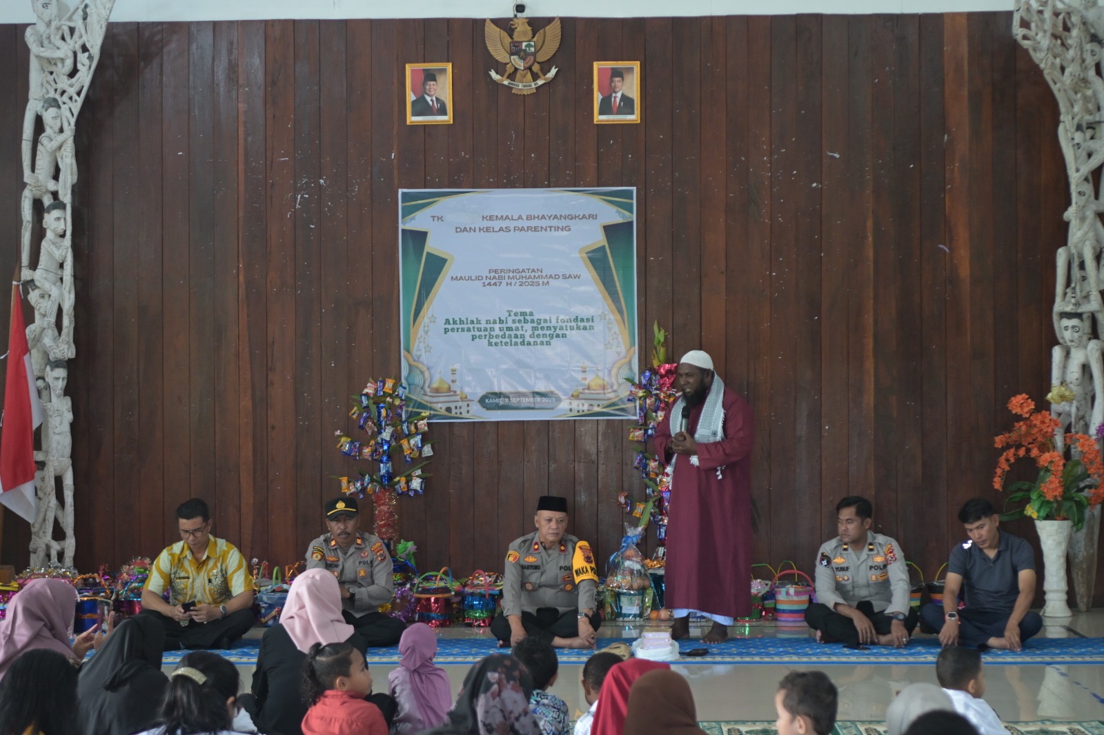 Papua – TK Kemala Bhayangkari Asmat bersama Kelas Parenting menggelar acara Peringatan Maulid Nabi Muhammad SAW 1447 H/2025 M yang berlangsung di Aula Wira Pratama Polres Asmat, Kamis (11/09).