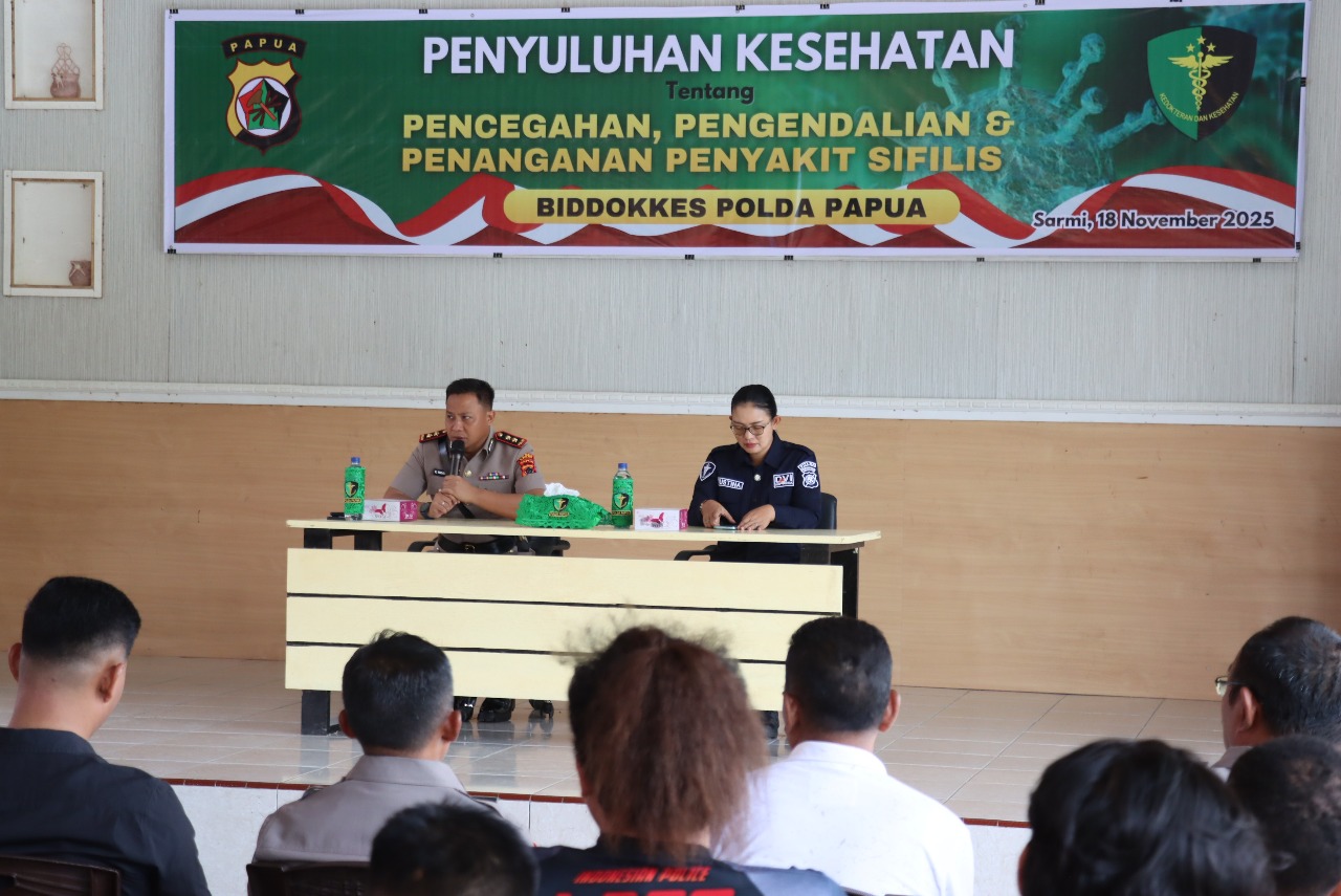 Sarmi – Personil Polres Sarmi mengikuti penyuluhan kesehatan tentang pencegahan dan pengendalian penyakit sifilis yang menghadirkan Tim Biddokkes Polda Papua serta tenaga medis dari Puskesmas Sarmi, Selasa (18/11/2025) bertempat di Aula Polres Sarmi.