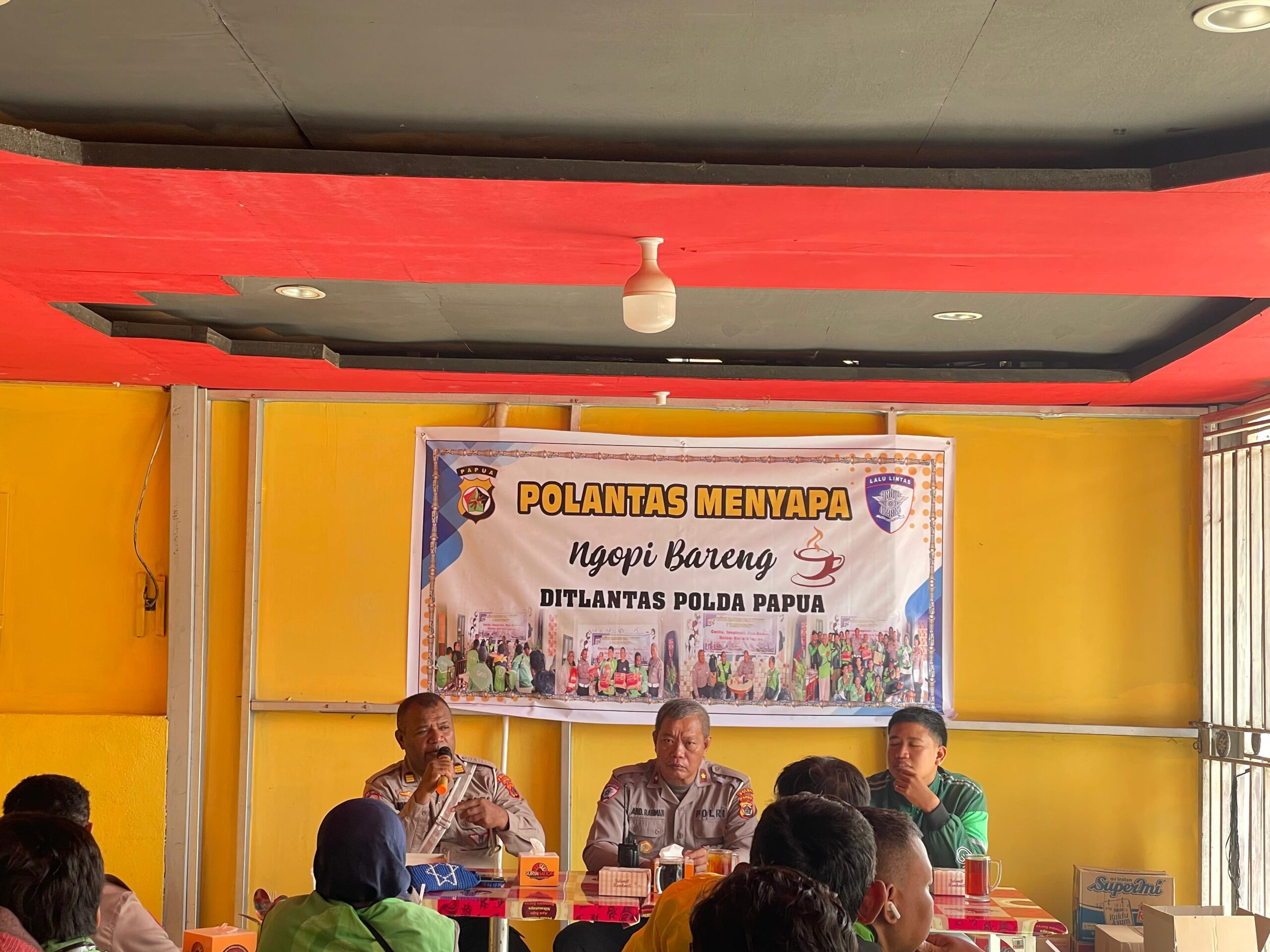 Papua – Direktorat Lalu Lintas Polda Papua terus berinovasi dalam mendekatkan diri dengan para pelaku transportasi daring melalui program “Polantas Menyapa”, yang kali ini menggandeng komunitas Gojek di wilayah Jayapura, bertempat di Café Apollo, Abepura, Kamis (10/07/25).