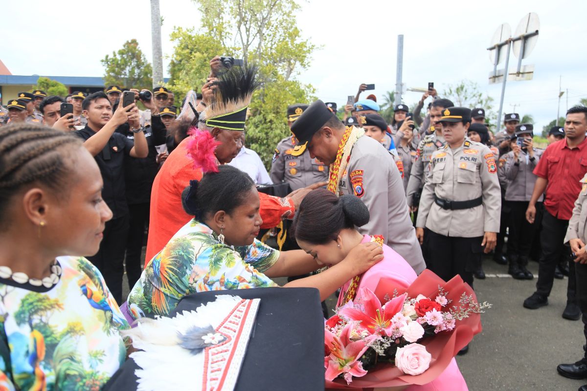 Penyambutan Kapolda Papua Barat yang baru dipimpin langsung oleh Wakapolda Papua Barat Brigjen Pol. Dr. Sulastiana, M.Si., CRGP., CHCM., CRPP., didampingi para Pejabat Utama (PJU), Kapolres jajaran serta seluruh personel Polda Papua Barat. Prosesi penyambutan ditandai dengan pengalungan tas noken dan injak piring sebagai bentuk penghormatan serta wujud pelestarian kearifan lokal Papua Barat.