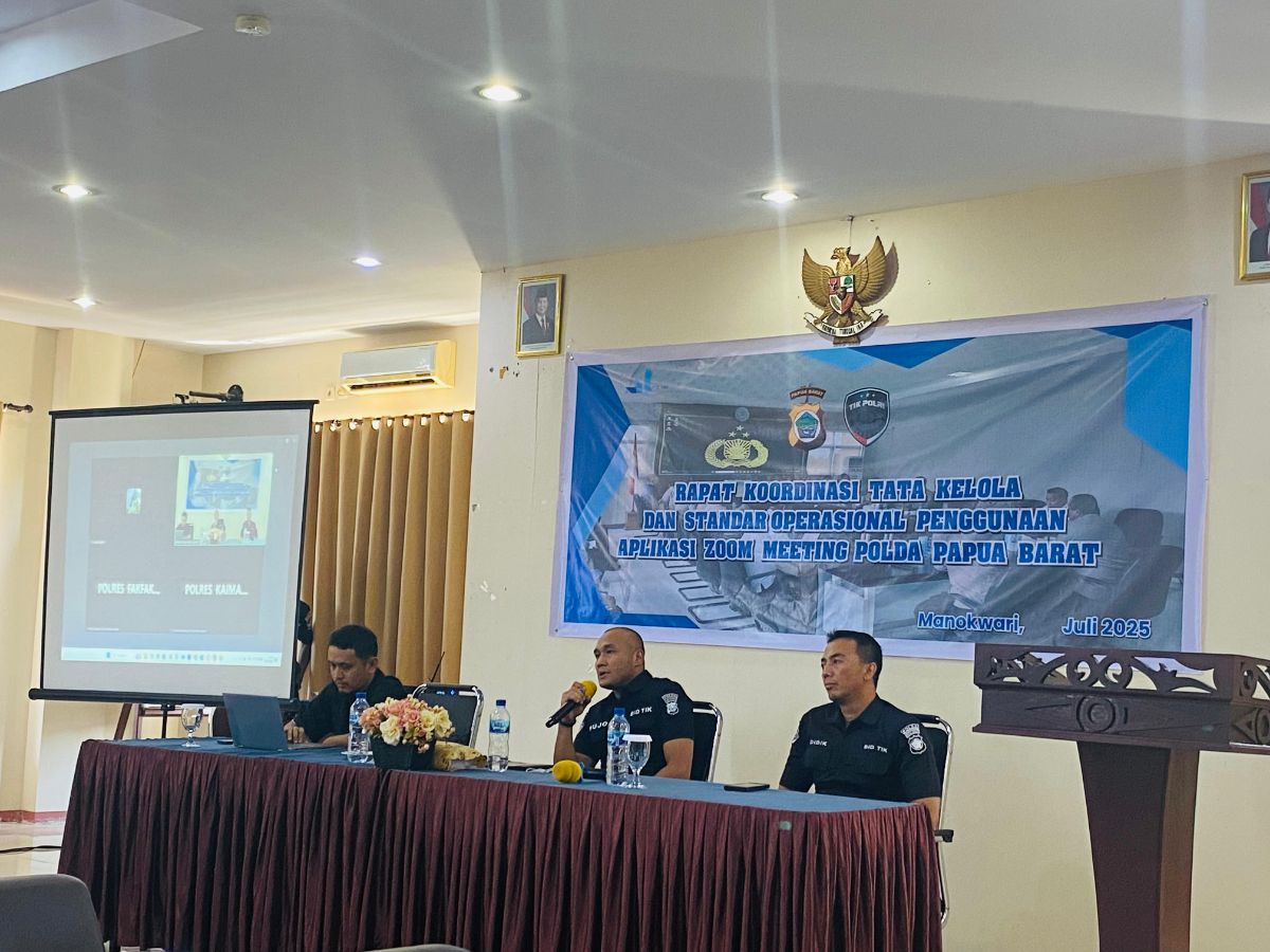 Manokwari – Kepolisian Daerah Papua Barat melalui Bidang Teknologi Informasi dan Komunikasi (TIK) menyelenggarakan Rapat Koordinasi Tata Kelola dan Standar Operasional Penggunaan Aplikasi Zoom Meeting serta Bimbingan Teknis Optimalisasi Layanan 110 untuk Peningkatan Pelayanan Kepolisian, yang dilaksanakan Rabu, (22/7)25).