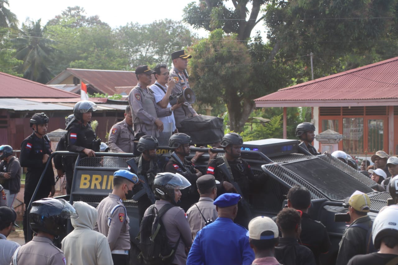 Kapolres Merauke AKBP Leonardo Yoga, S.I.K., M.M. bersama General Manager PT Telkom Papua, Bapak Anthonius Joko Sritomo, serta Kasat Binmas Iptu Baktiar Syarif, S.I.Kom, turun langsung menenangkan massa.