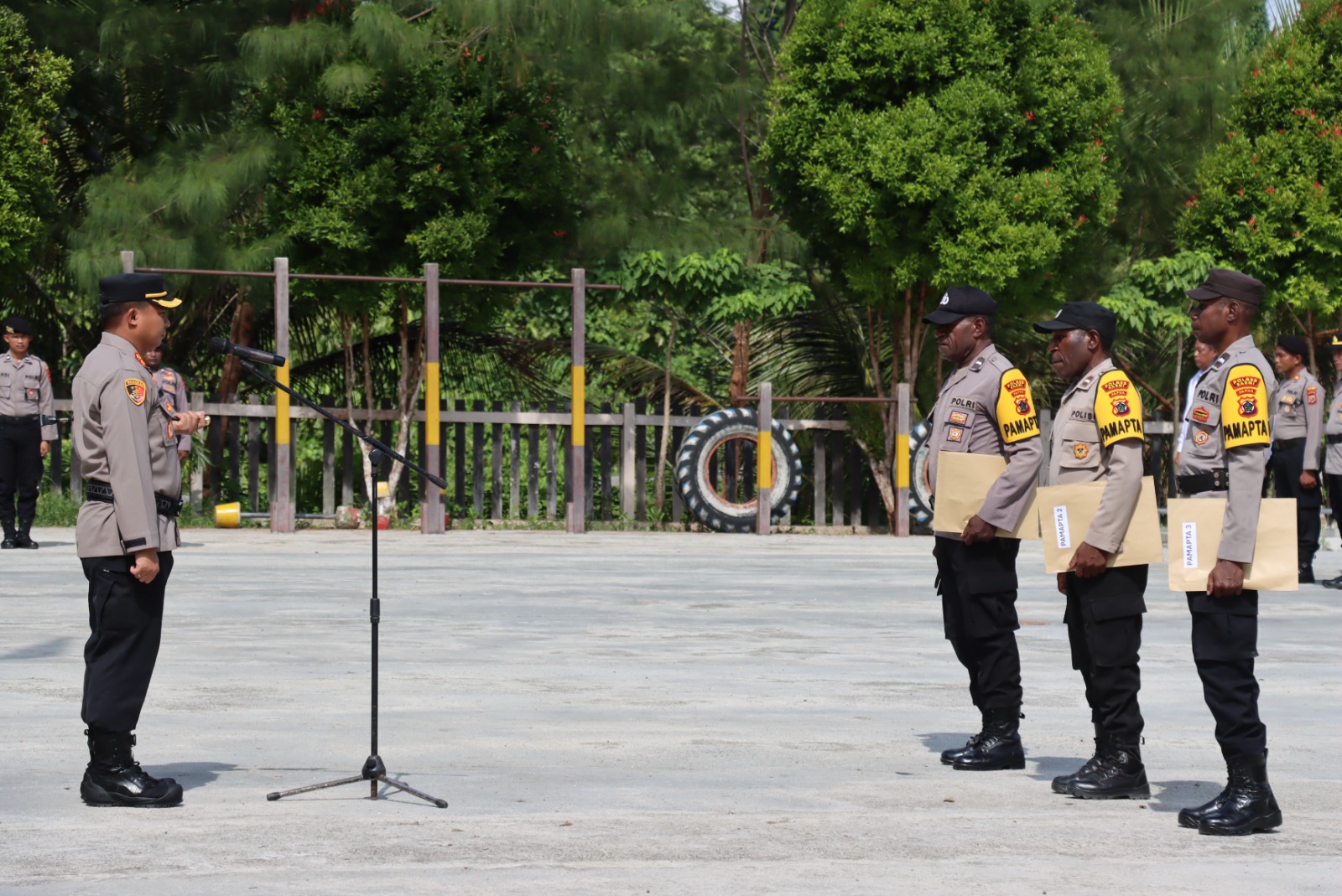 Kapolres Sarmi menyampaikan selamat kepada ketiga personel yang mendapat kepercayaan menjabat sebagai Pamapta, sekaligus menegaskan pentingnya peran Pamapta sebagai ujung tombak kesiapsiagaan Polri.