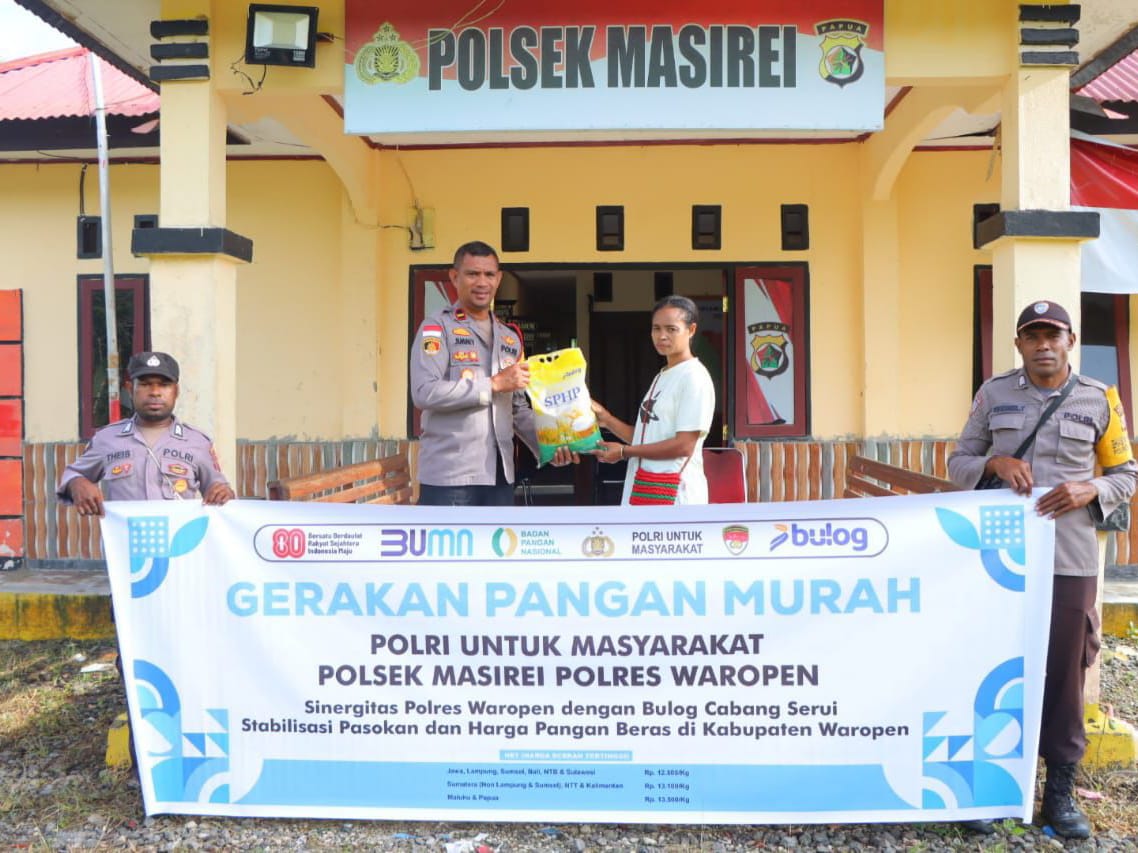 Papua – Dalam rangka mendukung ketahanan pangan dan menjaga stabilitas harga bahan pokok di wilayah hukumnya, Polsek Masirei menggelar Gerakan Pangan Murah Beras SPHP Sinergitas Polres Waropen dan Bulog Cabang Serui, bertempat di Mapolsek Masirei dan dilanjutkan di Perempatan Jalan Trans Masirei, Jumat (12/09/2025).