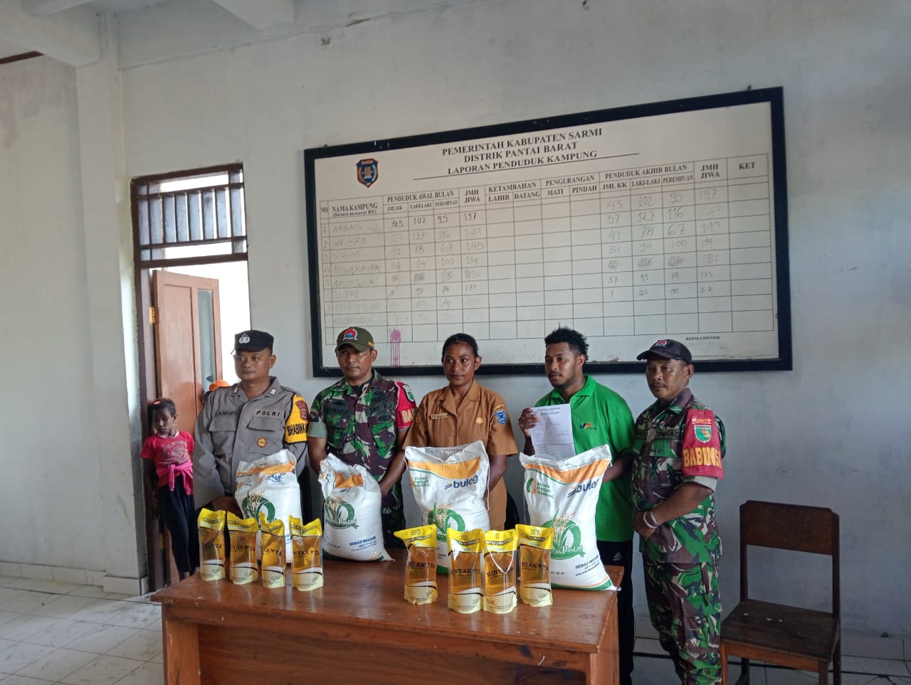 Kegiatan ini juga dihadiri oleh Danramil Pantai Barat Pelda Hamdin, Serka Irwan Suprio, dan Sertu Munakip, serta petugas bantuan pangan dari Bulog Provinsi Papua, pemerintah Distrik Pantai Barat, dan Ketahanan Pangan Pemda Kabupaten Sarmi.