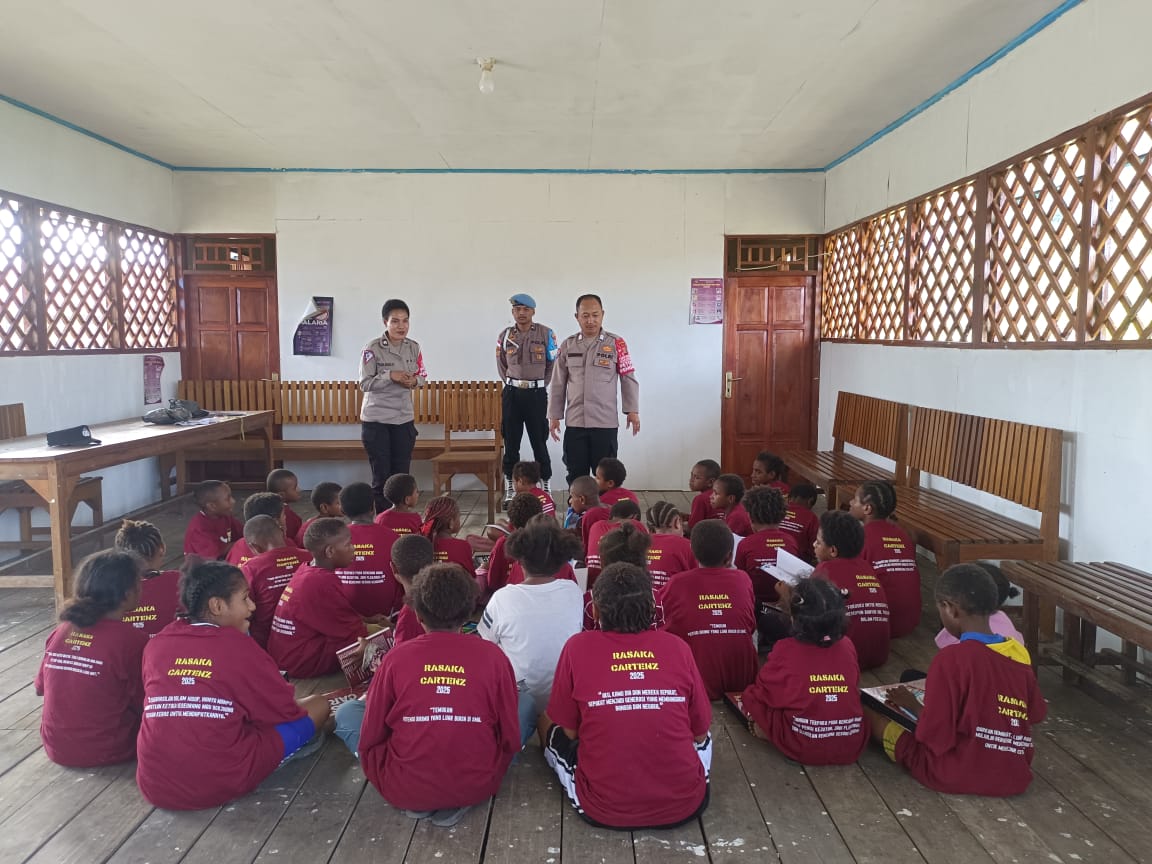 Papua — Program Si-IPAR (Polisi Pi Ajar), bagian dari Operasi Rasaka Cartenz 2025, Hadir Mengajar Ilmu Pengetahuan Dasar Kepada Anak-anak Generasi Penerus Bangsa, kegiatan dilaksanakan di Balai Kampung Kabiding Distrik Oksibil, Kabupaten Pegunungan Bintang, Oksibil. Sabtu (28/07) Sore.
