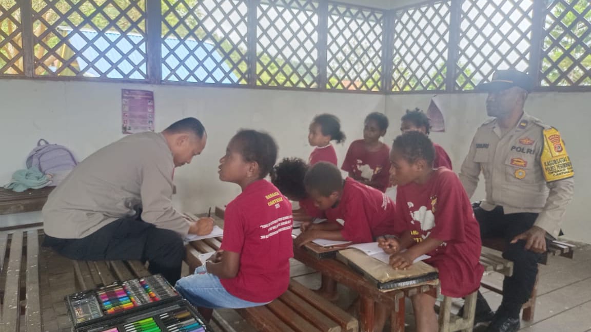 Papua — Program Si-IPAR (Polisi Pi Ajar), bagian dari Operasi Rasaka Cartenz 2025, Mengajar Membaca Bagi Anak-anak, kegiatan dilaksanakan di Balai Kampung Distrik Oksibil, Kabupaten Pegunungan Bintang, Oksibil Senin (08/09) Sore.