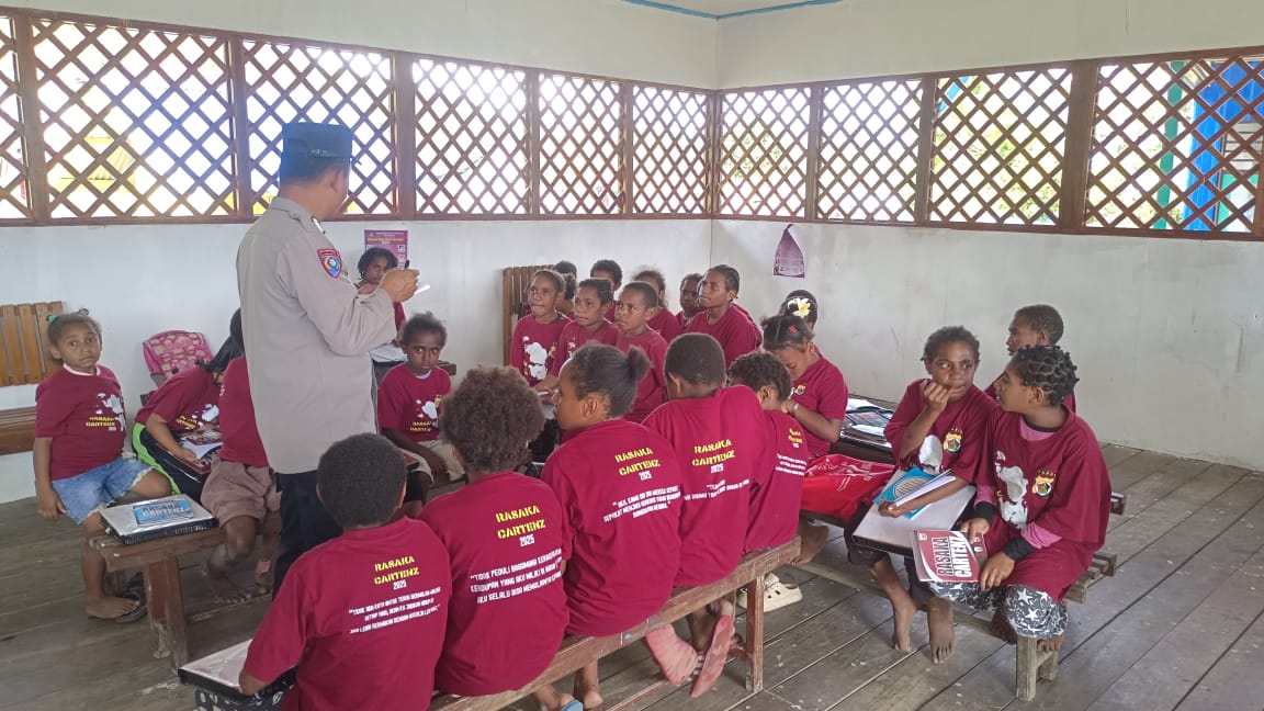 Papua – Program Si-IPAR (Polisi Pi Ajar), bagian dari Operasi Rasaka Cartenz 2025, Hadir Mengajar Membaca dan Menulis Kepada Anak-anak Generasi Emas Papua, kegiatan dilaksanakan di Balai Kampung Distrik Oksibil, Kabupaten Pegunungan Bintang, Oksibil. Selasa (12/08) Sore.