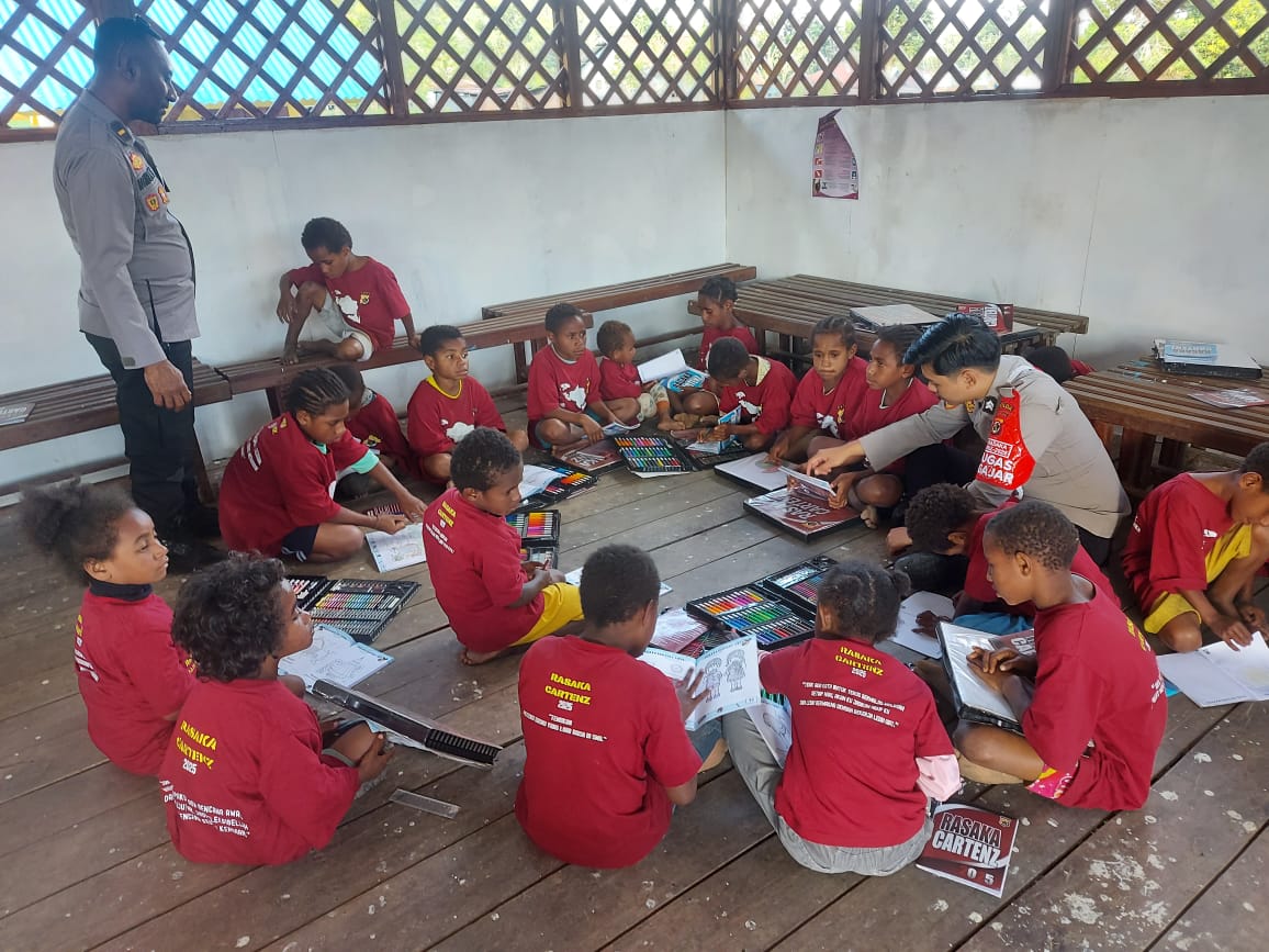 Dalam kegiatan tersebut, Anak-anak Belajar Membaca, Menulis Serta Mewarnai Gambar. terlihat jelas dari wajah anak-anak saat bermain sambil belajar bersama para anggota Polri. Kegiatan ini sekaligus menjadi ruang aman bagi Para anak-anak untuk berinteraksi dan mengembangkan diri.