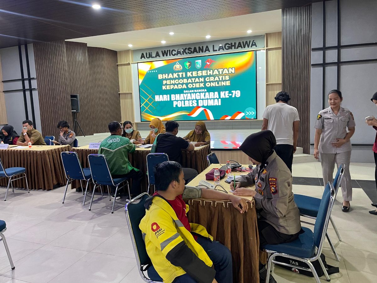 Jakarta – Menjelang HUT Bhayangkara ke-79, Polres Dumai menggelar bakti sosial dan kesehatan. Polisi memberikan pengobatan gratis hingga sembako kepada para pengemudi ojek online (ojol).