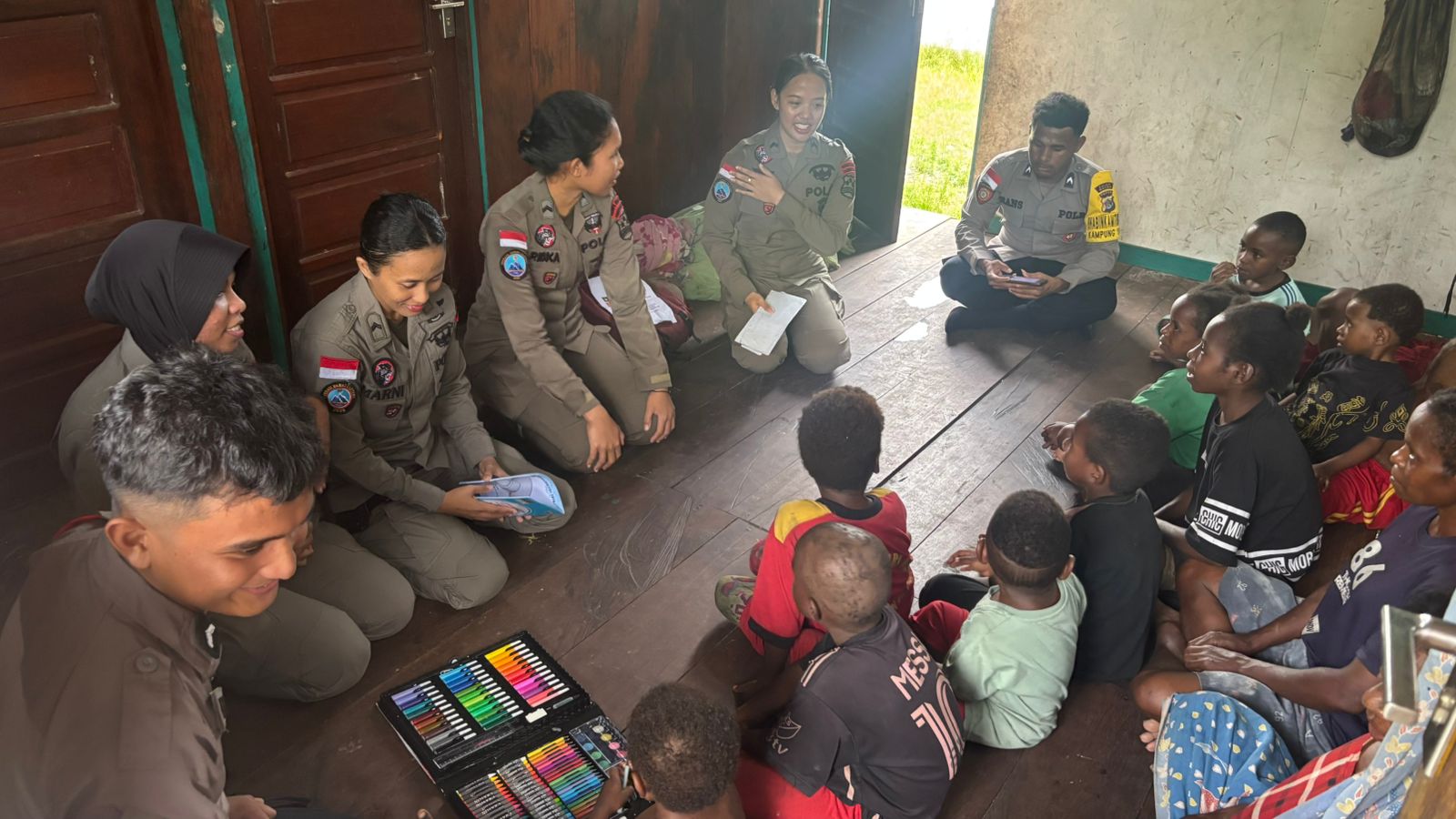 Papua – Sat Binmas Polres Nduga bersama Satgas ODC Damai Cartenz melaksanakan kegiatan pembelajaran membaca, menulis, dan mewarnai gambar kepada anak-anak Kampung Yunad, Distrik Kenyam, Kabupaten Nduga, Provinsi Papua Pegunungan, pada Kamis (21/08/25).