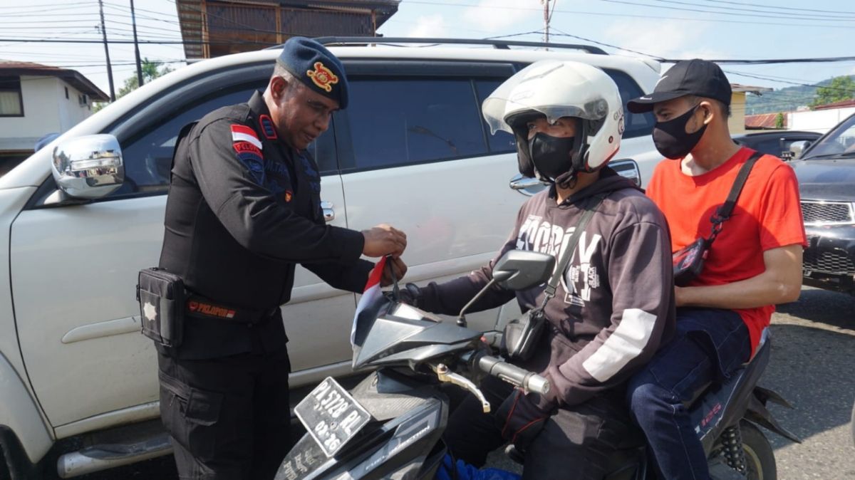 Kegiatan pembagian bendera merah putih ini dilakukan di kawasan Traffic Light depan Mako Satbrimob Polda Papua.