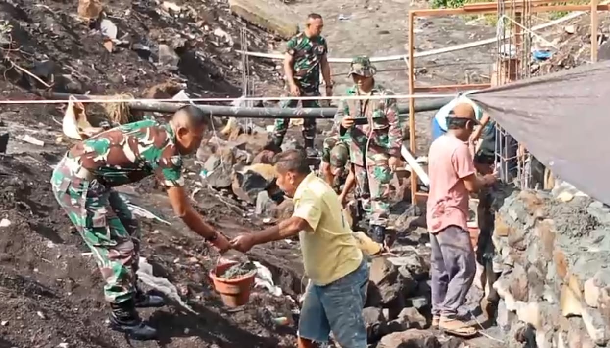 Bitung – Semangat gotong-royong terus ditunjukkan oleh aparat TNI dari Koramil 1310-01/Bitung Kodim 1310/Bitung, bersama masyarakat dan para pekerja dalam pembangunan jembatan beton di Kelurahan Girian Indah Kec. Girian Kota Bitung, Selasa (14/04/2026).