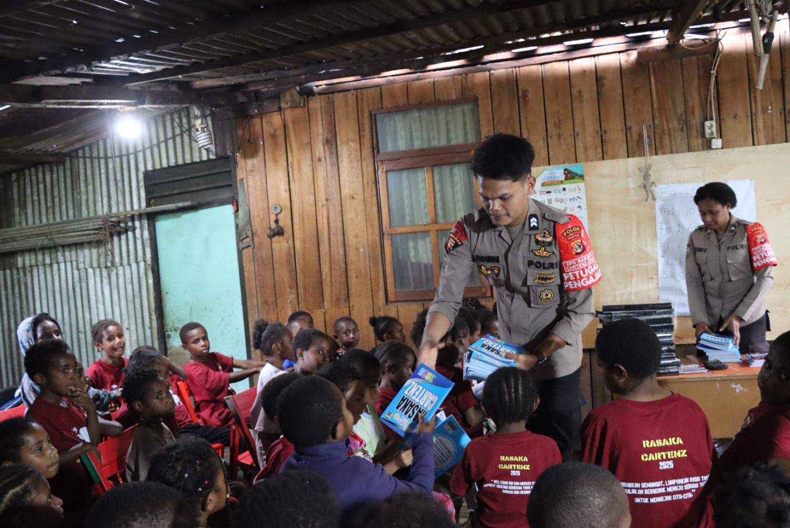 Kegiatan tersebut diisi dengan pembagian buku bacaan dan alat tulis kepada anak-anak setempat serta pendampingan belajar yang dilakukan langsung oleh personel Polri yang tergabung dalam Operasi Rasaka Cartenz 2025. Anak-anak terlihat sangat antusias mengikuti kegiatan yang diisi dengan pembelajaran interaktif dan edukatif tersebut.