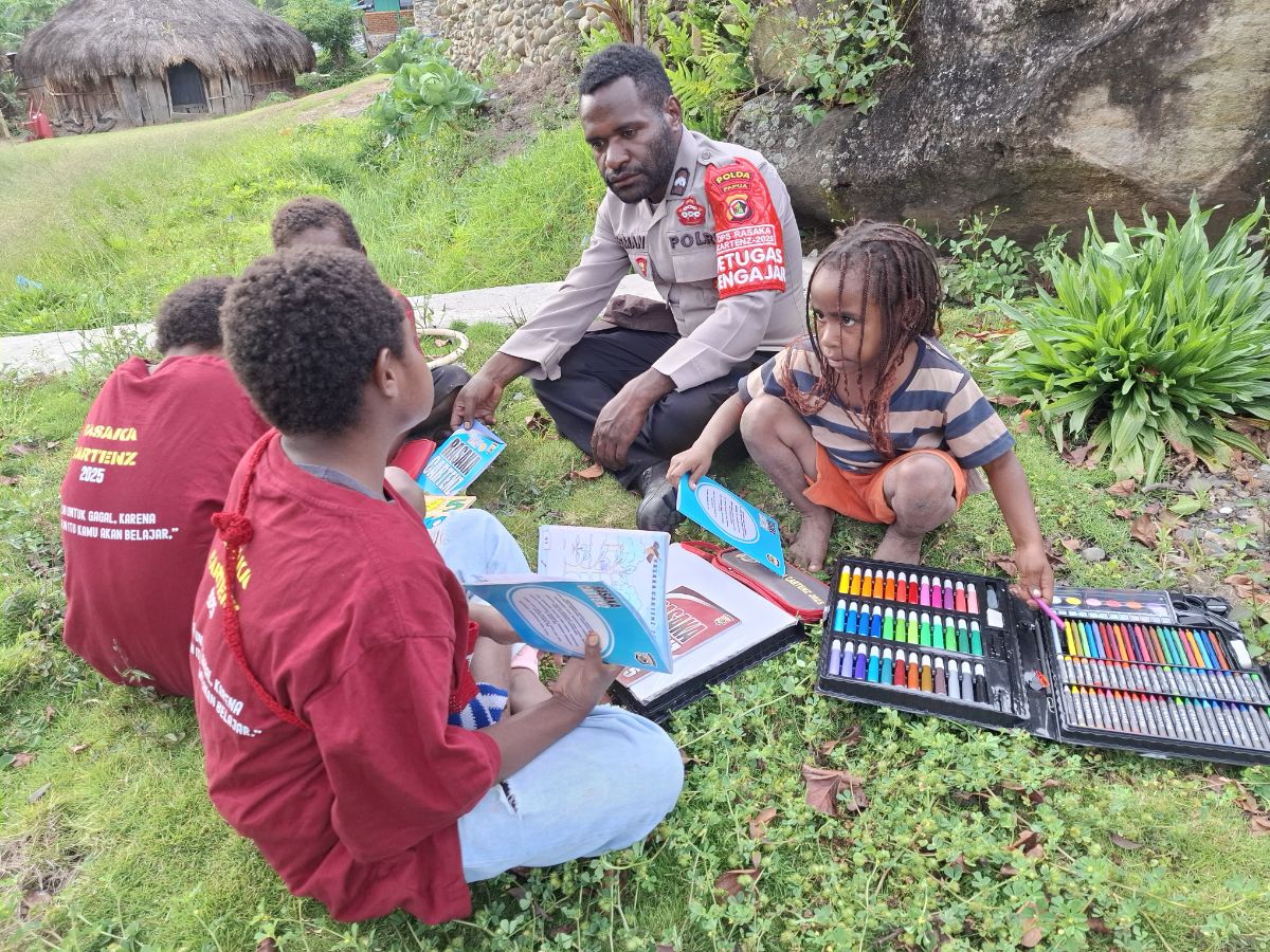 Subsatgas Si-Ipar Polres Lanny Jaya yang tergabung dalam Operasi Rasaka Cartenz 2025 melaksanakan kegiatan Polisi Pi Ajar bagi anak-anak di Kampung Yogobak, Distrik Nogi, Kabupaten Lanny Jaya.