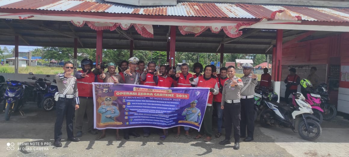 Sarmi – Dalam rangka mendukung pelaksanaan Operasi Zebra Cartenz 2025, Anggota Satuan Lalu Lintas Polres Sarmi melaksanakan kegiatan pembinaan dan penyuluhan (Binluh) kepada komunitas ojek yang beraktivitas di kawasan Pasar Sentral Mararena, Jumat (21/11/2025).