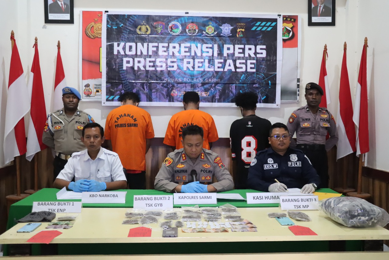 Dalam konferensi tersebut, Kapolres menjelaskan bahwa tiga kasus dimaksud melibatkan tersangka berinisial ENP alias A, GYB alias D, dan MP alias A, yang ditangkap pada waktu dan lokasi berbeda oleh Sat Resnarkoba Polres Sarmi.