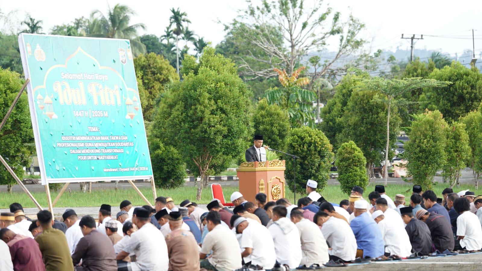 Turut hadir dalam kegiatan tersebut Pejabat Utama Polda Papua Barat, personel Polda Papua Barat, serta masyarakat umat Muslim di wilayah Manokwari yang bersama-sama melaksanakan ibadah Sholat Ied dalam suasana penuh kekhusyukan.