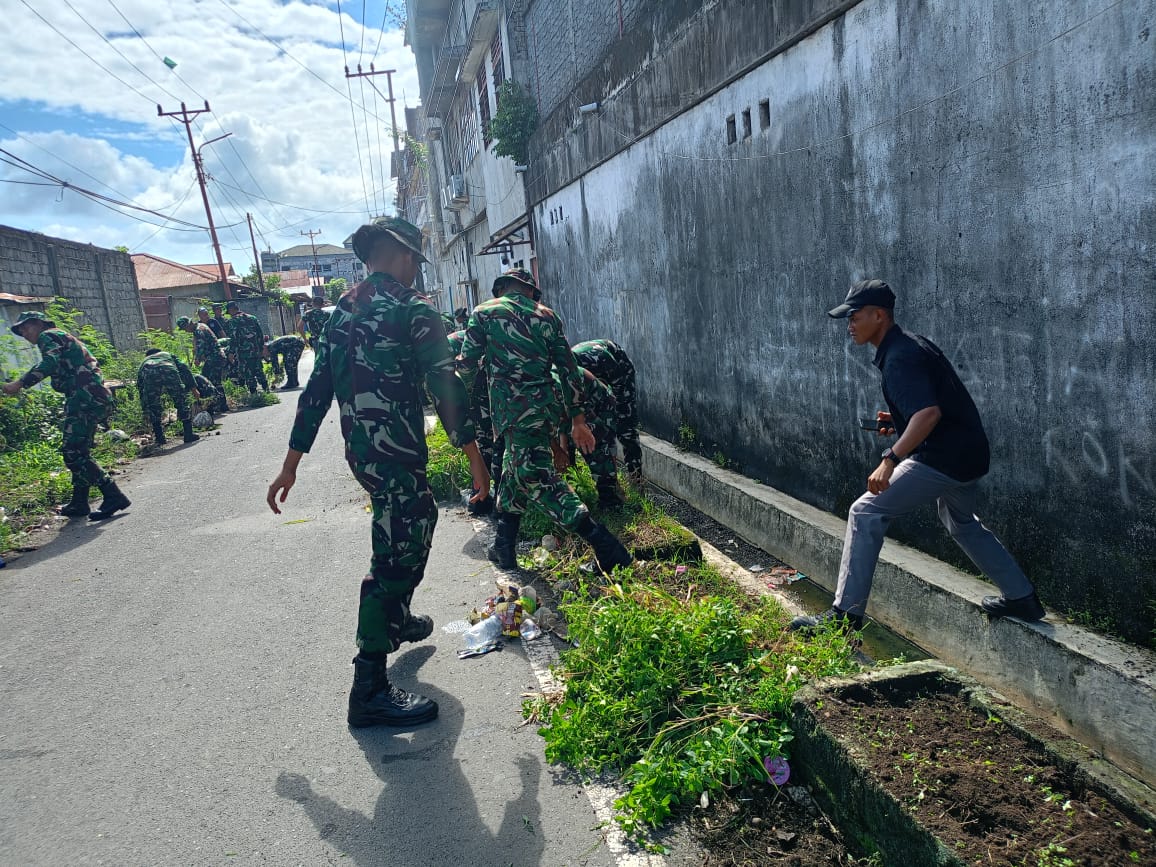 Bitung – Dalam rangka mendukung Gerakan Indonesia Asri, Personel Kodim 1310/Bitung dan Yonif TP 916/Bara Sakti Kodam XIII/Merdeka bersama masyarakat, melaksanakan kegiatan Karya Bakti pembersihan lingkungan bertempat di Kompleks Kanopi, Kelurahan Bitung Timur, Kecamatan Maesa, Kota Bitung, Rabu (18/03/2026).
